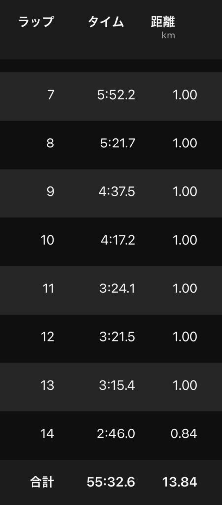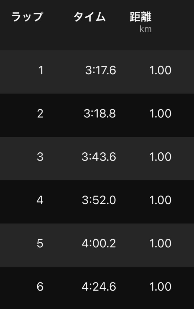 残り4キロは下りの力を借りて3’20″前後で刻むことが出来ました。